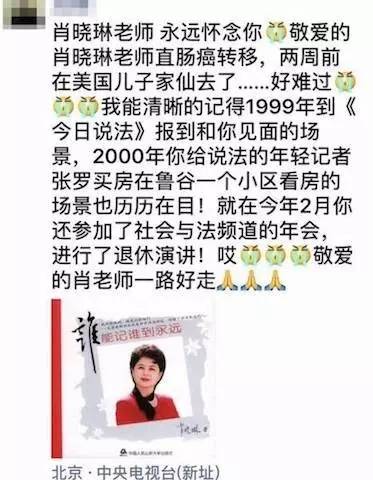 7月12日,有媒體報道稱,從央視《今日說法》欄目多名員工處獲悉,央視著名節目主持人、制片人肖曉琳因患直腸癌,近日在美國治病期間不幸離世。