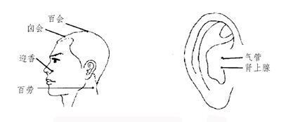 有效穴位 迎香、百會、囟會、百勞等穴,及氣管、腎上腺等耳穴(如圖1、圖2)。
