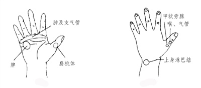 有效反射區 甲狀旁腺、喉及氣管、肺及支氣管、上身淋巴結、扁桃體、脾等反射區(圖5、圖6)。