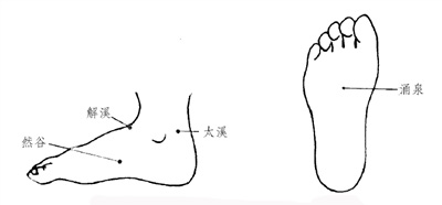 有效穴位 涌泉、解溪、然谷、太溪等穴位(圖7、圖8)。