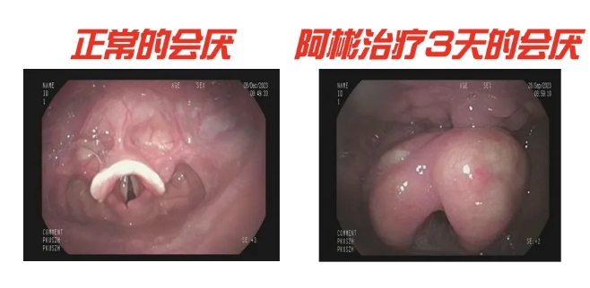 會厭,是咽喉要道的重要關卡。當我們吃飯吞咽時,會厭像蓋子一樣蓋住氣管,不讓食物進入氣管。但當會厭發炎時,這層“蓋子”就會不斷腫脹,嚴重時會腫成球狀,導致氣道封閉,人通不上氣。 而阿彬的會厭已經極度充血、像小球一樣腫了起來,完全擋住了呼吸的通道——聲門。隨時都有窒息的可能。