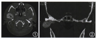 患者女性,58歲,因“右耳屏前腫物6個(gè)月余”入院。6年前不明原因張口時(shí)右側(cè)顳下頜關(guān)節(jié)區(qū)疼痛,呈間斷性針刺樣,持續(xù)1~2min后消失,未進(jìn)行任何治療。6個(gè)月前發(fā)現(xiàn)右耳前突起,間斷疼痛,漸進(jìn)性長大。近1個(gè)月張口受限,疼痛時(shí)間延長就診。