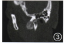 圖1CT可見病灶突出關(guān)節(jié)腔內(nèi)外側(cè)呈球狀生長;圖2顳下頜關(guān)節(jié)間隙不均一的高密度盤狀鈣化影,鈣化影與髁突之間可見潛在間隙,病灶沿關(guān)節(jié)間隙分布,并向間隙內(nèi)及外突出;圖3病灶向前內(nèi)突出至顳下窩.鈣化物超越關(guān)節(jié)腔向外突出至面部,向內(nèi)擴(kuò)展至顱底;
