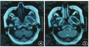 CT:右顳下頜關(guān)節(jié)有一不規(guī)則鈣化高密度灶,呈啞鈴形。外側(cè)部分類似球形,突破關(guān)節(jié)腔位于顴弓下方、乙狀切跡外側(cè)及髁突前方;中間部分沿關(guān)節(jié)腔分布,呈盤狀,與關(guān)節(jié)面間有潛在間隙,患例關(guān)節(jié)腔較健側(cè)明顯增寬;內(nèi)側(cè)部分跨越關(guān)節(jié)結(jié)節(jié)向前內(nèi)斜形進(jìn)入顳骨鱗部和蝶骨巖部,顱底骨質(zhì)破壞(圖1~3)。