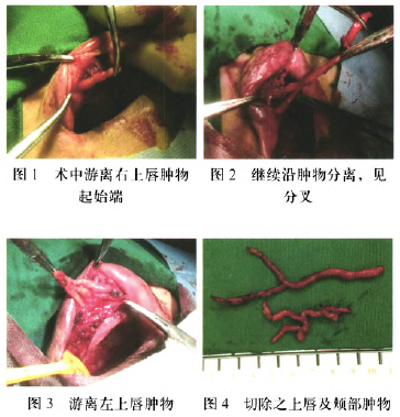 于局麻強化下行“右頰部及上唇腫物切除活檢術(shù)”。術(shù)中見右頰部腫物位于粘膜下,呈樹枝狀走形,表面不平滑,色白,質(zhì)中偏硬;沿腫物銳性分離可見數(shù)個分支,右頰部腫物與右上唇腫物相連;離斷分支時可見出血,少數(shù)細(xì)小分支離斷時無出血,可見斷端呈管腔狀;腫物末端深在,管腔進(jìn)入頰肌深部逐漸變細(xì),分離至條索狀腫物末端接近血管狀,易出血,結(jié)扎后將游離,將腫物切除,長約10.0 cm,呈分叉狀。左上唇腫物位于粘膜下,分離腫物,腫物性質(zhì)同前相似,呈樹枝狀。分離至肌層深層,管腔逐漸變細(xì),質(zhì)地正常至不易區(qū)分,結(jié)扎,摘除游離之腫物,長約5.0 cm(見圖1-圖4)。