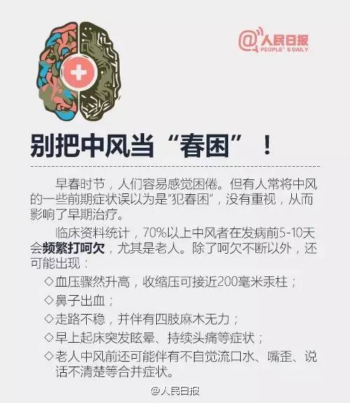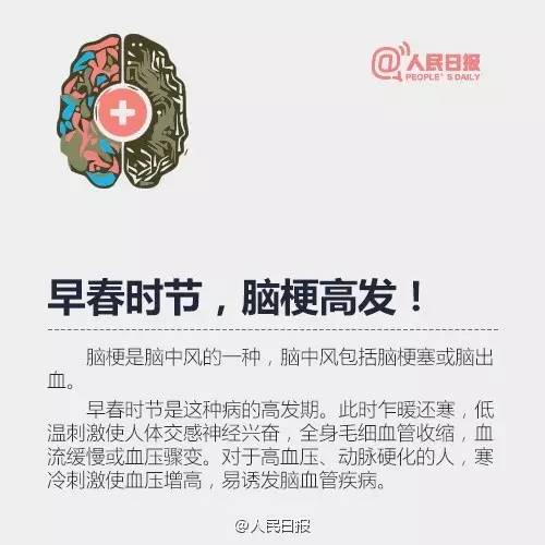 早春時節是腦梗的高發期。此時乍暖還寒,低溫刺激使人體交感神經興奮,全身毛細血管收縮,血流緩慢或血壓驟變。對于高血壓、動脈硬化的人,寒冷刺激使血壓增高,易誘發腦血管疾病。