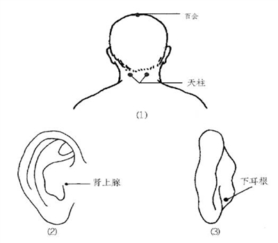 有效穴位 百會、天柱、腎上腺、下耳根等耳穴(圖1)。