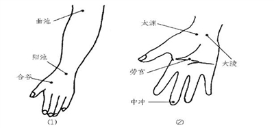 有效穴位 曲池、陽池、合谷、太淵、勞宮、中沖等穴(圖2)。