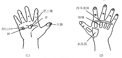 ①在大腦、腎上腺、腎、肝、脾反射區(qū)各按揉手部50~100次。