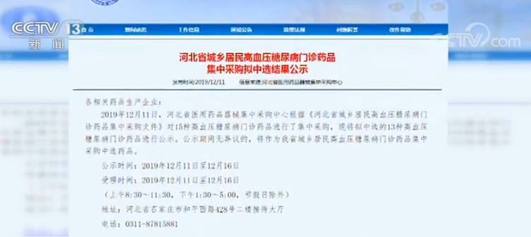 12月11日,河北省啟動了高血壓、糖尿病這“兩病”門診藥品的集中采購,通過全省集中采購來換取藥品價格的下降,減輕城鄉居民“兩病”患者的用藥負擔。本次中選的13種藥品藥價平均降幅接近70%。