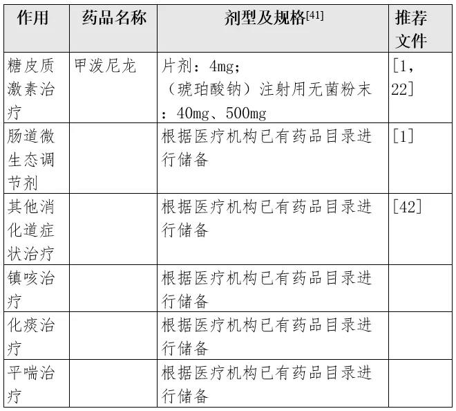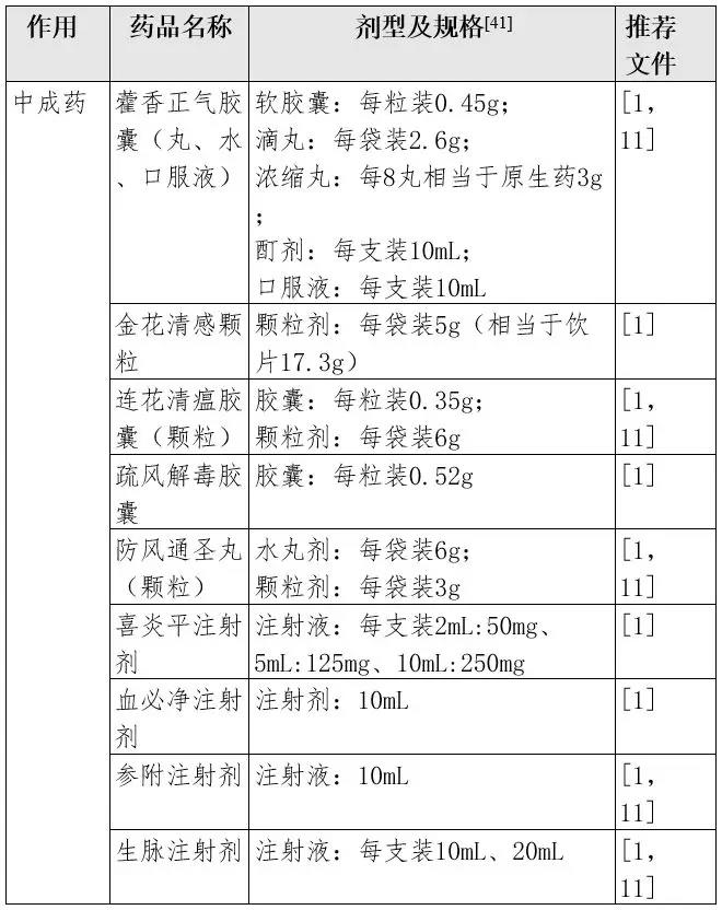——參見:國家衛(wèi)健委《新型冠狀病毒感染的肺炎診療方案(試行第五版)》新型冠狀病毒目前尚無確認(rèn)有效的針對性治療藥物。以下藥物可在臨床試用或處于臨床研究階段。由于相關(guān)疾病治療研究還在進(jìn)行,建議及時關(guān)注最新研究證據(jù)。可試用α-干擾素霧化吸入,成人每次500萬IU,加入滅菌注射用水2mL,每日2次。常見不良反應(yīng)包括發(fā)熱、疲勞、頭痛、關(guān)節(jié)痛、食欲不振等。注意對有抗生素過敏史的患者應(yīng)謹(jǐn)慎使用,初次用藥過程中應(yīng)嚴(yán)密監(jiān)測。霧化過程中應(yīng)注意避免接觸眼睛。保存及運輸過程中注意2-8℃避光保存。在特殊情況下使用注射液進(jìn)行霧化時,應(yīng)注意超適應(yīng)證的風(fēng)險問題。洛匹那韋/利托那韋膠囊:200mg/50mg每粒,每次2粒,每日2次,口服給藥。使用時應(yīng)注意整片吞咽,不能咀嚼、掰開或壓碎。可與食物同服。洛匹那韋/利托那韋口服液:80mg/20mg每毫升,每次5mL,每日2次。必須與食物同服,可以進(jìn)行管飼給藥。輔料中含有乙醇與丙二醇。輕中度肝功能不全、腎功能不全及行替代治療患者無需調(diào)整劑量。重度肝功能不全患者不建議使用。常見不良反應(yīng)包括腹瀉、惡心嘔吐、高甘油三酯血癥、上呼吸道感染、肝功能損害等。同時應(yīng)注意與其他藥物的相互作用問題。參照國家衛(wèi)生健康委員會診療方案(試行第五版),抗病毒治療可加用利巴韋林,成人8mg/kgiv每8小時一次。可透過胎盤與乳汁,有生殖毒性,停藥4周尚不能完全從體內(nèi)清除。在SARS和MERS期間有過大劑量利巴韋林的臨床應(yīng)用經(jīng)驗,但也發(fā)現(xiàn)大劑量使用時可能出現(xiàn)與劑量相關(guān)的貧血,可能在用藥后3-5天出現(xiàn),存在基礎(chǔ)心臟疾病患者可能出現(xiàn)因貧血導(dǎo)致的心功能惡化。此外也有低電解質(zhì)紊亂與中樞神經(jīng)系統(tǒng)毒性的報道,故臨床應(yīng)用需謹(jǐn)慎[8,9]。根據(jù)WHO指南建議[10],建議給予經(jīng)驗性抗菌藥物,對于考慮膿毒癥的患者,應(yīng)在初次評估1小時內(nèi)給予經(jīng)驗性抗菌治療。使用過程中注意輸注速度與配置后可放置時間,觀察可能出現(xiàn)的過敏反應(yīng)如皮疹等;口服制劑應(yīng)注意與微生態(tài)制劑等間隔2小時服用。可根據(jù)患者呼吸困難程度、胸部影像學(xué)進(jìn)展情況,酌情短期內(nèi)(3-5天)使用糖皮質(zhì)激素,建議每天劑量不超過相當(dāng)于甲潑尼龍1-2mg/kg[1,6]。使用過程中應(yīng)監(jiān)測血糖、電解質(zhì),可能出現(xiàn)中樞興奮癥狀,常見如失眠等,可對癥處理。可對癥使用解熱鎮(zhèn)痛、鎮(zhèn)咳、化痰、止吐、緩瀉劑、解痙、腸道微生態(tài)調(diào)節(jié)劑等藥物。3.1.7 藿香正氣膠囊(丸、水、口服液)[1,11]功能為解表化濕,理氣和中。口服。軟膠囊:一次2-4粒,一日2次;滴丸:一次2.6g,一日2次;水、口服液:5-10mL,一日2次,用時搖勻。文獻(xiàn)報道不良反應(yīng)有引起藥疹、紫癜、休克等過敏反應(yīng)及腸梗阻、上消化道出血、過敏性哮喘、酒醉貌樣過敏、過敏性休克,外用引起腸梗阻、小兒低血糖、小兒抽搐、雙硫侖樣反應(yīng)。風(fēng)熱感冒者慎用。孕婦慎用。有高血壓、心臟病、肝病、糖尿病、腎病等慢性病嚴(yán)重者應(yīng)謹(jǐn)慎使用。藿香正氣水因含酒精,酒精過敏者禁用。服藥后不得駕駛機、車、船、從事高空作業(yè)、機械作業(yè)及操作精密儀器,不可與替硝唑、甲硝唑等藥物合并使用[12]。功能為疏風(fēng)宣肺,清熱解毒。用開水沖服。一次1袋,一日3次,療程3天。常見不良反應(yīng)包括惡心、嘔吐等胃腸道不良反應(yīng),偶見用藥后肝功能異常,心悸或皮疹。對本品過敏者禁用。運動員及脾胃虛寒者慎用,既往有肝臟病史或服藥前肝功能異常者慎用,孕婦、哺乳期婦女,兒童及老齡人群謹(jǐn)慎使用。成分中的麻黃可升高血壓,因此高血壓患者慎用,同時服藥時需監(jiān)測血壓[13]。功能為清瘟解毒,宣肺泄熱。口服。膠囊:一次4粒,一日3次;顆粒:一次1袋,一日3次。文獻(xiàn)報道[1,11]該藥可能易導(dǎo)致消化系統(tǒng)不良反應(yīng),也可導(dǎo)致皮疹、瘙癢等皮膚及附件損害。成分中的麻黃可升高血壓,因此高血壓、心臟病患者慎用。有肝病、糖尿病、腎病等慢性病嚴(yán)重者,兒童、孕婦、哺乳期婦女、年老體弱及脾虛便溏者謹(jǐn)慎使用。對本品過敏者禁用。過敏體質(zhì)者及運動員慎用。功能為疏風(fēng)清熱,解毒利咽。口服。膠囊:一次4粒,一日3次。偶見惡心的不良反應(yīng)。過敏體質(zhì)及對本品過敏者禁用。結(jié)膜熱、皰疹性咽峽炎、妊娠及哺乳期婦女謹(jǐn)慎使用。3.1.11 防風(fēng)通圣顆粒[1,11]功能為解表通里,清熱解毒。口服。一次1袋,一日2次。不良反應(yīng)偶見胃腸道反應(yīng)、皮疹、痛癢等。脾虛便溏者忌用。成分中的麻黃可升高血壓,因此高血壓、心臟病患者慎用。肝病、糖尿病、腎病等謹(jǐn)慎服用。孕婦,運動員,兒童、哺乳期婦女、年老體弱、過敏體質(zhì)者慎用。對本品過敏者禁用。肌內(nèi)注射:成人一次50-100mg,一日2-3次;小兒酌減或遵醫(yī)囑;靜脈滴注:一日250-500mg,加入5%葡萄糖注射液或0.9%氯化鈉注射液稀釋后靜脈滴注;或遵醫(yī)囑。兒童:一日按體重5-10mg/kg(0.2-0.4ml/kg),最高劑量不超過250mg,以5%