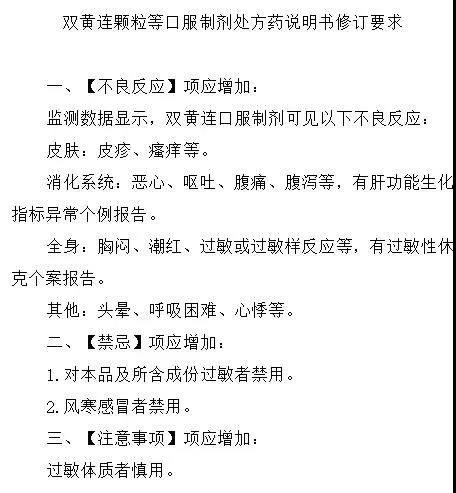 以上不良反應為筆者能夠找到相應案例的不良反應,還有部分不良反應表現資料較少,這里有一份國家藥監局要求修訂的說明書,是今年3月國家藥監局發布的對雙黃連口服制劑說明書修訂的通知所含內容。