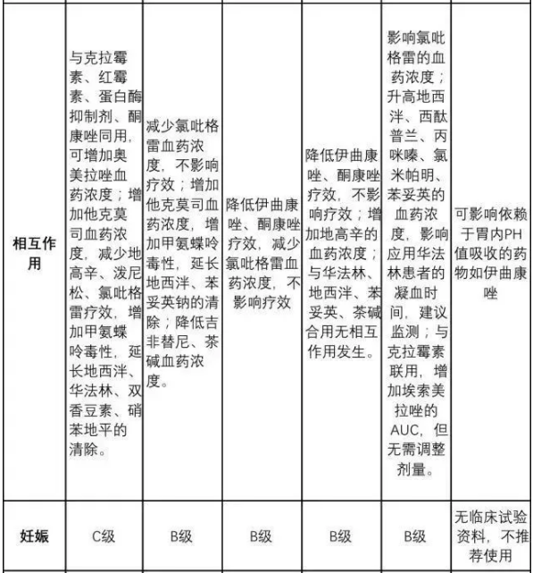 根據藥品說明書,各類妊娠藥物的安全等級分別為奧美拉唑(C級)、蘭索拉唑(B級)、泮托拉唑(B級)、雷貝拉唑(B級)及埃索美拉唑(C級),應根據孕婦具體情況謹慎用藥;