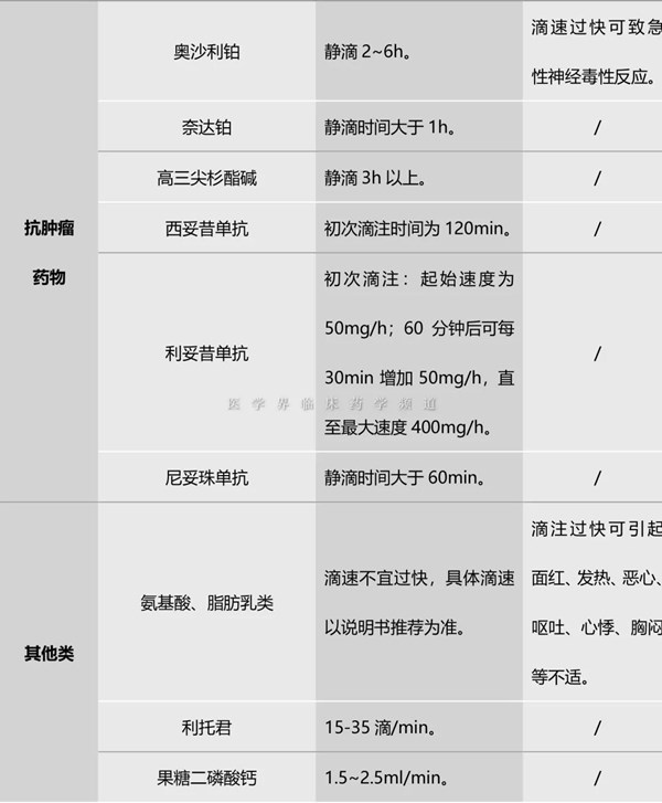 查看左氧氟沙星氯化鈉注射液的剩余的液體量才發(fā)現(xiàn),患者15分鐘內(nèi)滴注了80ml液體,滴速大大超出說明書的規(guī)定:每100ml至少滴注60分鐘。靜脈輸液一直為臨床治療和挽救患者生命的重要給藥方式,藥物會通過靜脈血管進入血液循環(huán),起效快,避免了口服吸收不完全的問題,劑量相對準(zhǔn)確,也能避免肝臟的首過效應(yīng)。在藥物作用迅速的同時,一旦發(fā)生輸液反應(yīng)、過敏反應(yīng)或其他嚴(yán)重不良反應(yīng)往往也是十分嚴(yán)重和緊急,甚至還會危及生命。輸液過程中,除了要確保藥物濃度穩(wěn)定外,也應(yīng)控制好滴速。通常情況下,成年人靜脈輸液速度一般為40~60滴/分,但最佳滴速應(yīng)該由醫(yī)護人員根據(jù)用藥者的年齡、疾病狀態(tài)和藥物性質(zhì)來決定。案例中的患者因為滴速過快引起嚴(yán)重的后果,若搶救不及時可能會致命。由此看來,合理控制滴速不容小覷。根據(jù)藥物的不同性質(zhì),需要緩慢靜脈滴注的藥物主要有中藥注射劑(成分復(fù)雜,容易引起過敏反應(yīng))、有機硝酸酯類(滴注過快易致血壓下降)、部分抗菌藥物、含鉀的制劑等。而且,特殊人群如兒童、老年人和心腎功能較差的患者滴速也必須緩慢,否則會因短時間內(nèi)輸入大量液體而使心臟負(fù)擔(dān)過重,甚至導(dǎo)致心力衰竭。現(xiàn)將需要緩慢靜滴的藥物整理如下表,供用藥參考:- 青霉素和頭孢菌素類藥物半衰期短,為了達到藥物在體內(nèi)的有效濃度,通常要在1h內(nèi)滴完,且青霉素的水溶液不太穩(wěn)定,快速滴完也可以減少過敏反應(yīng)的發(fā)生;
