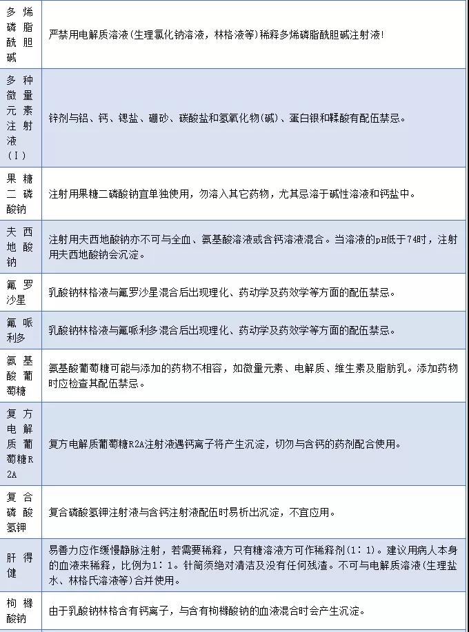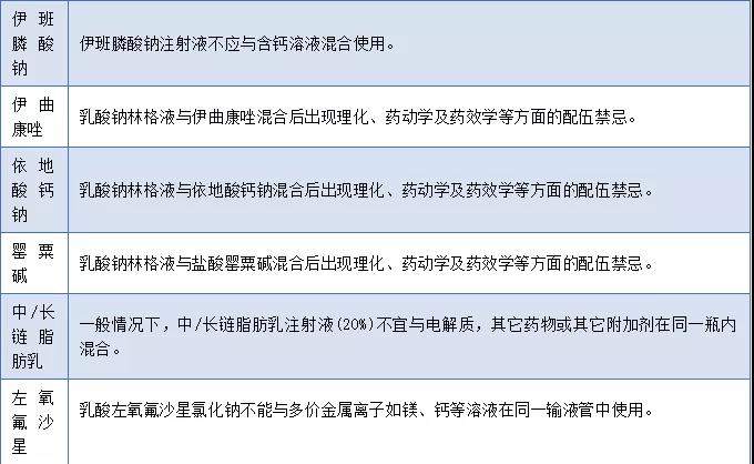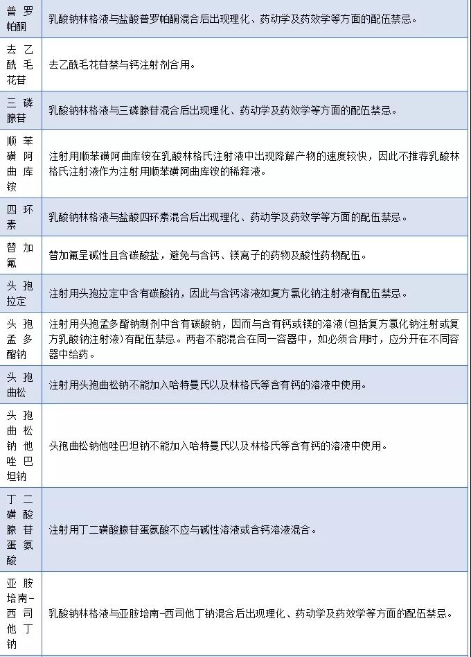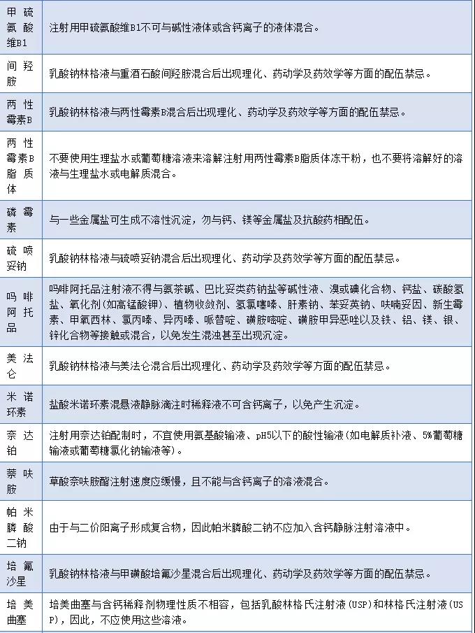 復方氯化鈉注射液是臨床上常用的晶體液,內含氯化鈉 0.85%、氯化鉀 0.03%、氯化鈣 0.033%,其配伍禁忌藥品甚多,一方面因為電解質本身不宜與部分藥物配伍(與氯化鈉注射液忌配的藥物顯然也不宜與復方氯化鈉注射液配伍),另一方面更主要的是,鈣為高價金屬離子,藥物配伍需考慮其影響因素。