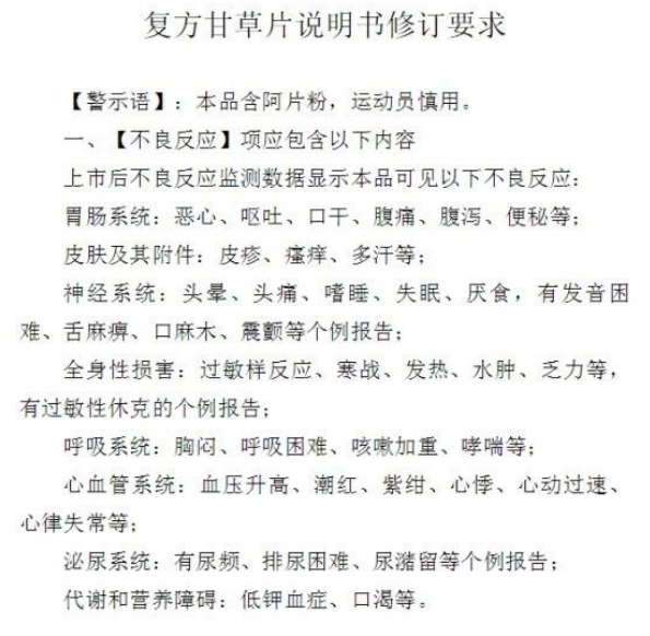 會購買一種經典的鎮咳藥 復方甘草片 甘草片,全名是復方甘草片,由甘草流浸膏、樟腦、八角、茴香、阿片粉、苯甲酸鈉等物質組成,是一種強力止咳藥。 甘草浸膏是保護性鎮咳祛痰劑,樟腦、八角、茴香能刺激支氣管黏膜,稀釋痰液使痰容易咳出,阿片粉能夠抑制咳嗽反射中樞,起鎮咳的作用。 甘草片的主要成分都比較常見 除了一樣東西——阿片粉 阿片的大名就是鴉片 從罌粟未成熟的果實中提取出來 當然,拋開劑量談毒性都是耍流氓 在規定范圍內 阿片有很好的止痛鎮咳效果 但是阿片屬于中樞性鎮咳 這種會抑制咳嗽中樞 當咳嗽中樞被抑制后 痰液會蓄積在呼吸道中 就會導致咳嗽反反復復,難以好轉 嚴重的甚至會因為痰咳不出而窒息 且人體對阿片的代謝能力是有限的 長期服用甘草片 可能會使得阿片成癮 讓人越吃越停不下來 在停藥后還可能出現冒冷汗、失眠 焦躁不安等戒斷反應 另一方面,復方甘草片的不良反應非常大 輕則會有惡心、口干、便秘等反應 重則患者會出現嗜睡的情況 如果治療不及時 還有可能造成心衰、腎衰 甚至周期性癱瘓 早在2005年,復方甘草片就被歸為處方藥,不建議自行購買,應在醫生的指導下使用。 2020年,為進一步保障用藥安全,國家藥監局發布了《關于修訂復方甘草片說明書的公告》,對復方甘草片說明書中的“不良反應”和“注意事項”等內容進行了修訂。 圖片來源:藥品說明書 要注意的是,并非所有咳嗽都能用復方甘草片,它主要用于無痰或少痰的咳嗽,如果是痰很多的咳嗽,阿片粉不利于痰液咳出。過敏性咳嗽和肺炎引起的咳嗽也不能使用甘草片。