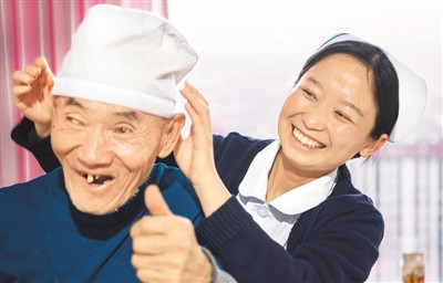 在陜西省榆林市榆陽區老年護理院,副護士長白渤(右)在護理一名特困人員。新華社記者陶明攝