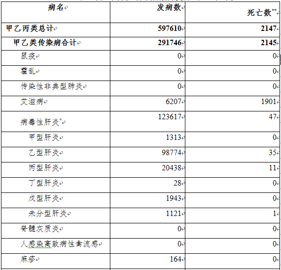 注:發(fā)病數(shù)與死亡數(shù)按照終審日期進(jìn)行統(tǒng)計(jì);*:病毒性肝炎的發(fā)病數(shù)、死亡數(shù)為甲型肝炎、乙型肝炎、丙型肝炎、丁型肝炎、戊型肝炎、未分型肝炎報(bào)告發(fā)病數(shù)、死亡數(shù)的合計(jì);**:通過傳染病網(wǎng)絡(luò)直報(bào)系統(tǒng)報(bào)告的死亡數(shù)據(jù)不作為中國傳染病死因順位依據(jù);***:自2019年5月1日起“結(jié)核性胸膜炎”歸入肺結(jié)核分類統(tǒng)計(jì),不再報(bào)告到“其他法定管理以及重點(diǎn)監(jiān)測(cè)傳染病”中。