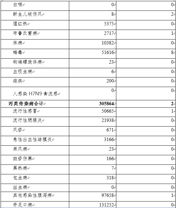 同期,丙類傳染病中絲蟲病無發(fā)病、死亡報(bào)告,其余10種丙類傳染病共報(bào)告發(fā)病305864例,死亡2人。報(bào)告發(fā)病數(shù)居前3位的病種依次為手足口病、其他感染性腹瀉病和流行性感冒,占丙類傳染病報(bào)告病例總數(shù)的91%。