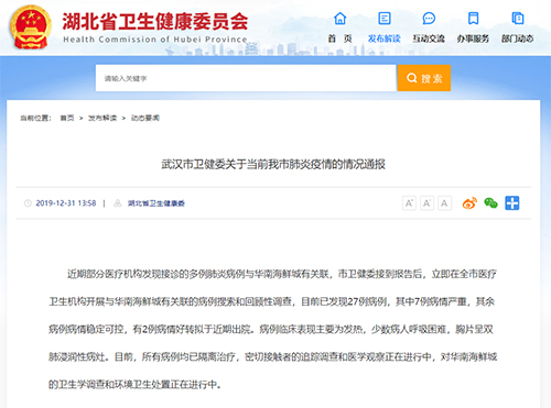 人民網北京12月31日電(董童) 湖北省衛生健康委員會于今日在官網發布了《武漢市衛健委關于當前我市肺炎疫情的情況通報》(以下簡稱“通報”)。