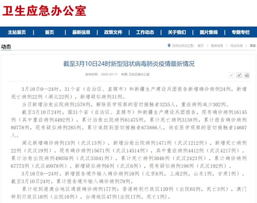 國家衛生健康委于11日在官網發布的《截至3月10日24時新型冠狀病毒肺炎疫情最新情況》(以下簡稱“情況”)稱,3月10日0—24時,31個省(自治區、直轄市)和新疆生產建設兵團報告新增確診病例24例,新增死亡病例22例(湖北22例),新增疑似病例31例。當日新增治愈出院病例1578例,解除醫學觀察的密切接觸者3235人,重癥病例減少302例。
