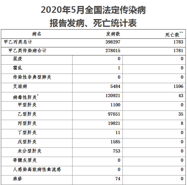 2020年5月(2020年5月1日0時至5月31日24時),全國(不含香港、澳門特別行政區和臺灣地區,下同)共報告法定傳染病398297例,死亡1783人。
