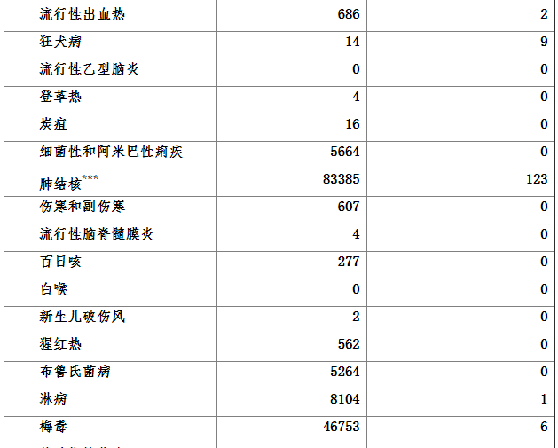 其中,甲類傳染病中霍亂報告1例病例, 無死亡報告。乙類傳染病中傳染性非典型肺炎、脊髓灰質炎、人感染高致病性禽流感、流行性乙型腦炎、白喉和人感染H7N9禽流感無發病、死亡報告,其余21種乙類傳染病共報告發病278014例,報告死亡1781人。報告發病數居前5位的病種依次為病毒性肝炎、肺結核、梅毒、淋病以及細菌性和阿米巴性痢疾,占乙類傳染病報告病例總數的95%。5月1日0時至5月31日24時,全國31個省(自治區、直轄市)和新疆生產建設兵團報告新型冠狀病毒肺炎確診病例 143例,死亡1人。