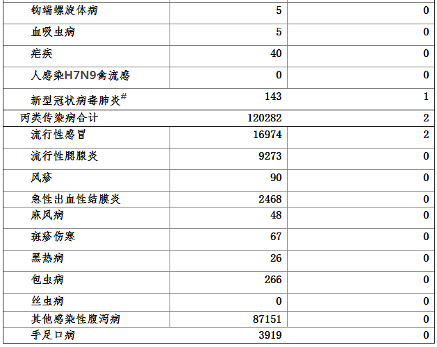 注:發病數與死亡數按照終審日期進行統計;*:病毒性肝炎的發病數、死亡數為甲型肝炎、乙型肝炎、丙型肝炎、丁型肝炎、戊型肝炎、未分型肝炎報告發病數、死亡數的合計;**:通過傳染病網絡直報系統報告的死亡數據不作為中國傳染病死因順位依據;***:自2019年5月1日起“結核性胸膜炎”歸入肺結核分類統計,不再報告到“其他法定管理以及重點監測傳染病”中。#傳染病網絡直報系統監測報告數據。