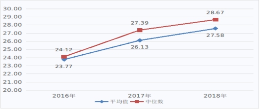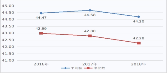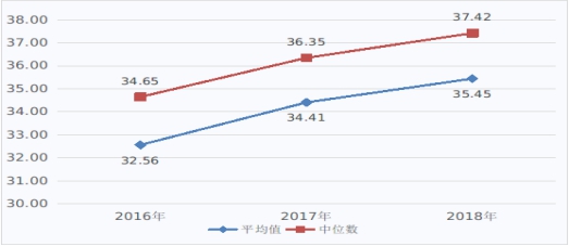 圖1 2016-2018年醫(yī)療服務(wù)收入(不含藥品、耗材、檢查檢驗收入)占醫(yī)療收入比例(%)