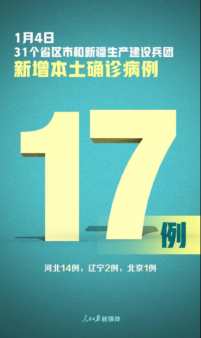 1月4日0—24時,31個?。ㄗ灾螀^、直轄市)和新疆生產建設兵團報告新增確診病例33例,其中境外輸入病例16例(上海6例,廣東4例,天津1例,遼寧1例,江蘇1例,福建1例,河南1例,四川1例),本土病例17例(河北14例,遼寧2例,北京1例);無新增死亡病例;無新增疑似病例。
