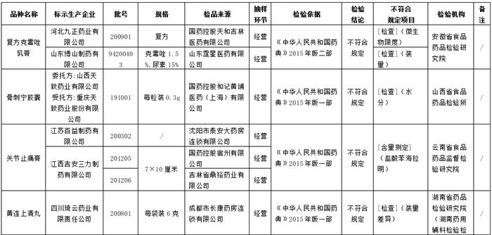 經安徽省食品藥品檢驗研究院檢驗,標示為河北九正藥業有限公司生產的1批次復方克霉唑乳膏不符合規定,不符合規定項目為微生物限度;標示為山東博山制藥有限公司生產的1批次復方克霉唑乳膏不符合規定,不符合規定項目為裝量。