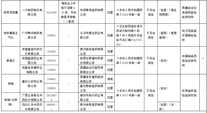 經甘肅省藥品檢驗研究院檢驗,標示為重慶眾妙藥業有限公司生產的2批次柴胡不符合規定,不符合規定項目為性狀;標示為廣西玉林泰龍中藥飲片有限公司生產的1批次柴胡(北柴胡)不符合規定,不符合規定項目為性狀;標示為四川仁禾中藥飲片有限公司生產的1批次柴胡(北柴胡)不符合規定,不符合規定項目為雜質。