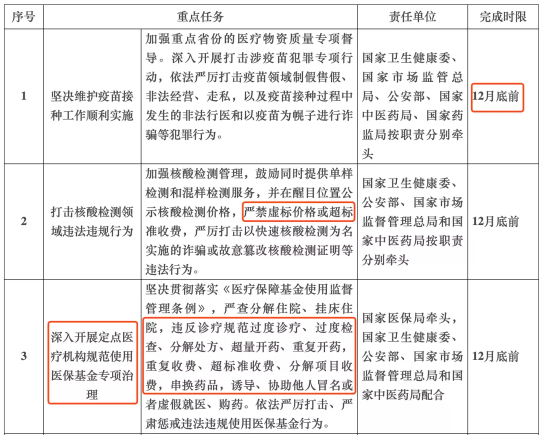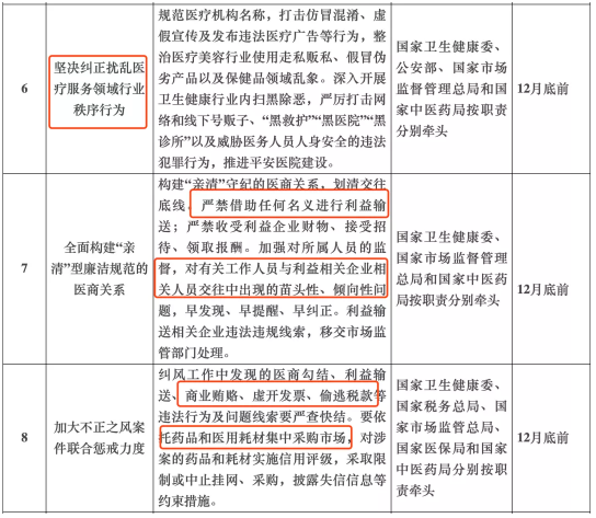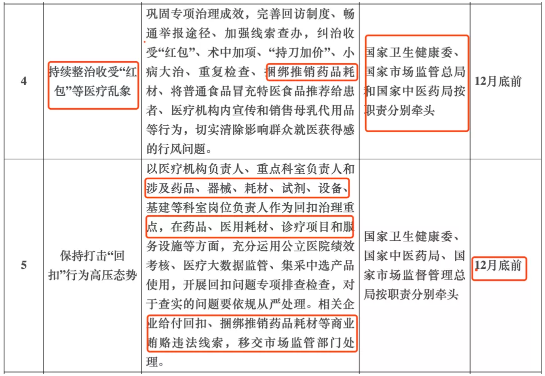 要求自2021年至2024年,集中開展整治“紅包”、回扣專項行動,加大監督檢查、執紀執法力度,對違反行業紀律的醫務人員,批評教育一批、通報處理一批、嚴肅清理一批,對涉嫌利益輸送的各類機構,嚴肅懲處、移送線索、行業禁入,持續保持對“紅包”、回扣行為的高壓打擊態勢。
