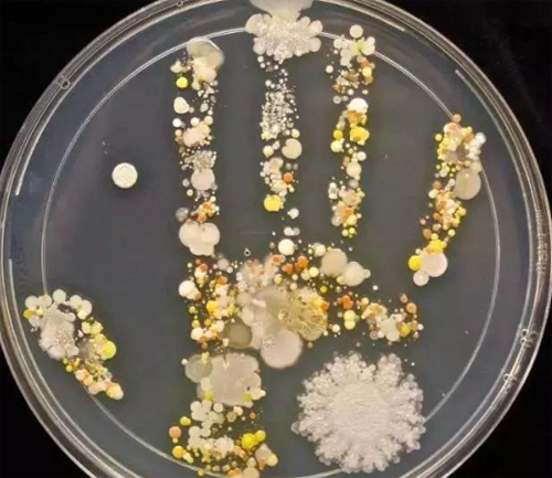 很簡單,這是一個8歲男孩兒在院子里玩了會兒后,用手在一種培養基上輕輕印了一下,再培養幾天,就長成這個樣子了……看到這兒,可能您明白了,這些花瓣都是細菌吧?是啊,那些各種顏色的花瓣,都是不同的細菌家族呢!