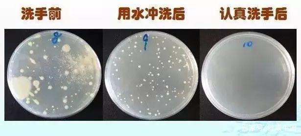 我們做了個實驗來驗證。首先對從公共場所回來的人的手進行涂抹采樣,然后讓她用水沖手后,再采一個樣,最后用香皂認真清洗、擦干后,再采一個樣。結果呢?不洗手的話,培養基上可以看到大片的菌落,手經過流水沖洗后,菌落數少了一些,但還是有很多;用香皂認真洗手并擦干后,肉眼看不到細菌生長!可見,只用水沖一沖,效果很有限,要想洗干凈手,還是需要用香皂的。