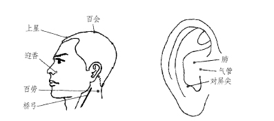 有效穴位 迎香、百會、上星、橋弓、百勞等穴,及肺、氣管、對屏尖等耳穴。(圖1、圖2)