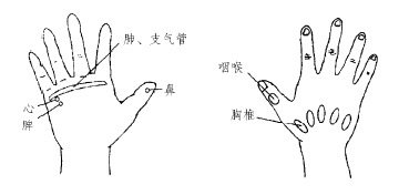 有效反射區 肺、支氣管、心、脾、鼻、咽喉、胸椎等手部反射區(圖3、圖4)。