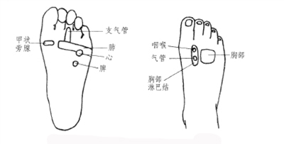 按摩手法 ①肺、支氣管反射區每次各推壓20~30次。②心、脾、胸椎、咽喉反射區每次各按揉20~30次。