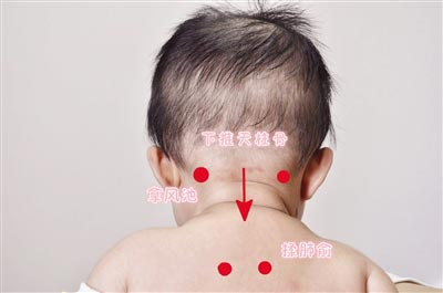 下推天柱骨:沿頸后發(fā)際正中至大椎穴成一直線(xiàn)為天柱骨,用拇指指面或食指、中指指面自上而下直推,稱(chēng)“下推天柱骨”。