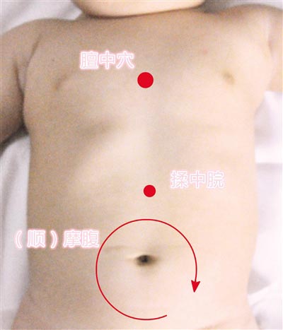 摩腹:小兒腹部,肚臍周?chē)鸀楦埂S檬终苹虿n四指在該處做順時(shí)針環(huán)形摩動(dòng)稱(chēng)“摩腹”。