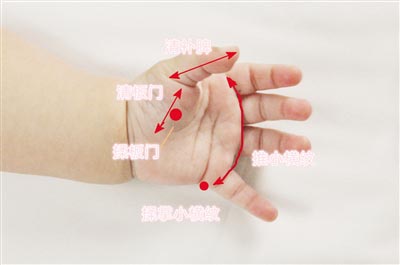 擦膻中:前正中線(xiàn)上,兩乳頭連線(xiàn)的中點(diǎn)為膻中。用手掌大魚(yú)際(大拇指一側(cè))上下擦該處稱(chēng)“擦膻中”。