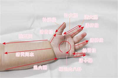 推拿處方:清胃經(jīng)200次,清補(bǔ)脾經(jīng)300次,退六腑100~200次,清大腸300次,清小腸200次,摩腹300次,推下七節(jié)骨200~300次。