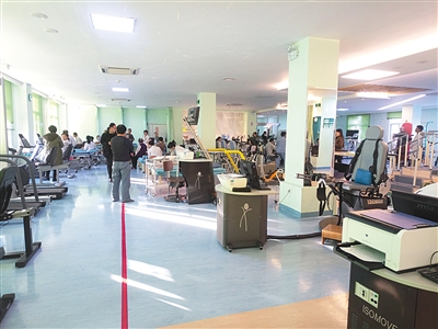 昨日,西城區展覽路醫院六樓,一間超過百平米的房間是康復治療室。