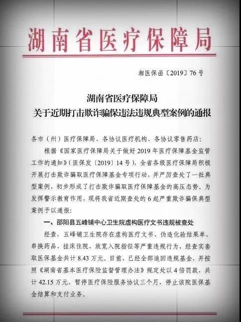 11月26日,湖南省醫(yī)療保障局下發(fā)湘醫(yī)保函(2019)76號文件《湖南省醫(yī)療保障局關(guān)于近期打擊欺詐騙保違法違規(guī)典型案例的通報》。