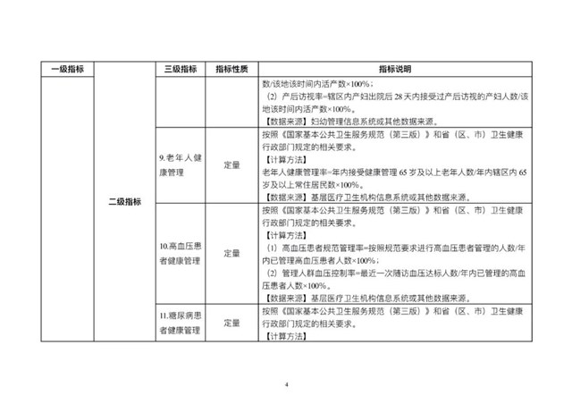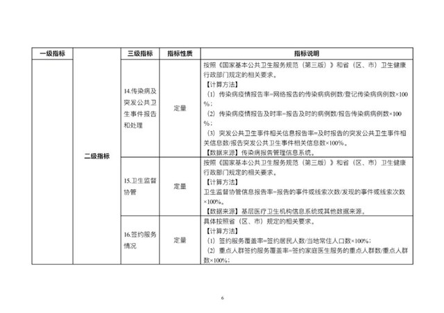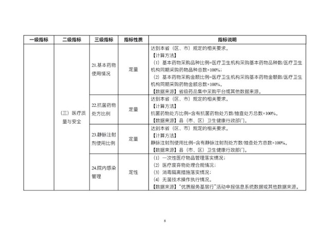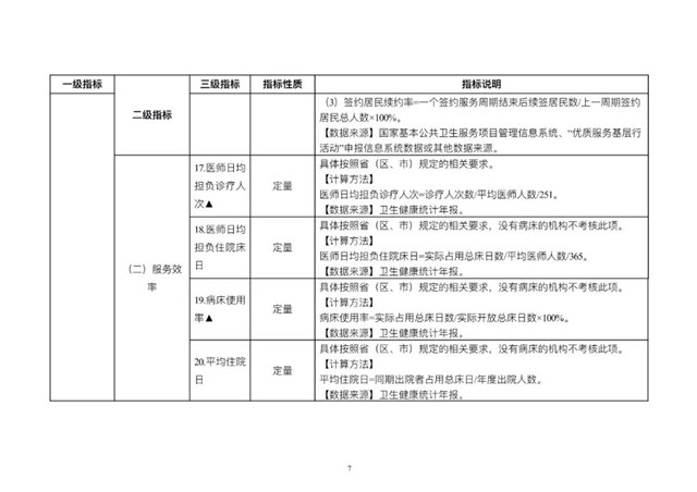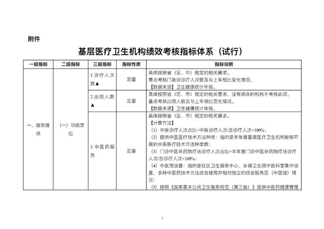 (一)服務提供。重點評價基層醫療衛生機構功能定位、服務效率、醫療質量與安全。通過基本醫療服務、基本公共衛生服務、簽約服務等指標考核功能定位情況;通過人員負荷指標考核醫療資源利用效率;通過合理用藥、院內感染等指標考核基層醫療質量與安全。