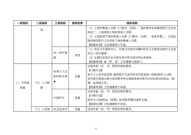 (三)可持續發展。重點評價人力配置和人員結構情況。通過人力配置指標考核基層醫療衛生機構可持續發展潛力;通過人員結構指標考核基層醫療衛生機構人力資源配置合理性。